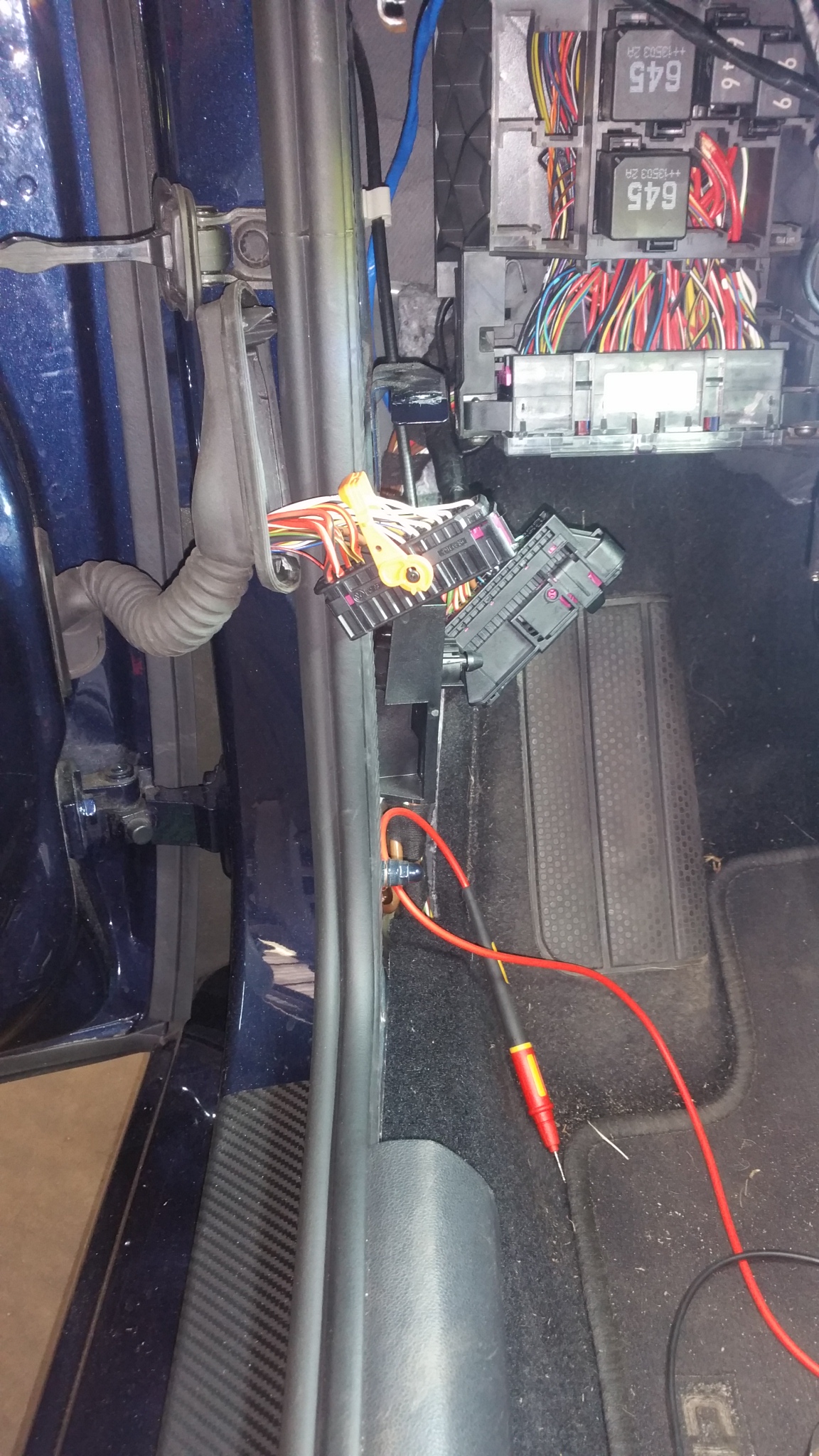 Het is naast het vervangen van de kabelbomen in de deuren, en het leggen (bijtrekken onder het dashboard) van 2 draden van de 28 pins (polig) connectoren/stekkers, bestuurders portier naar bijrijders portier, pin 28<>28 en 27<>27 (zie foto 2) aanleggen van links naar rechts! de 8 extra 4x vrouw 4x man, stekkers (amp) die je nodig heb, heb ik gehaald bij Vag Techniek in Nuenen.