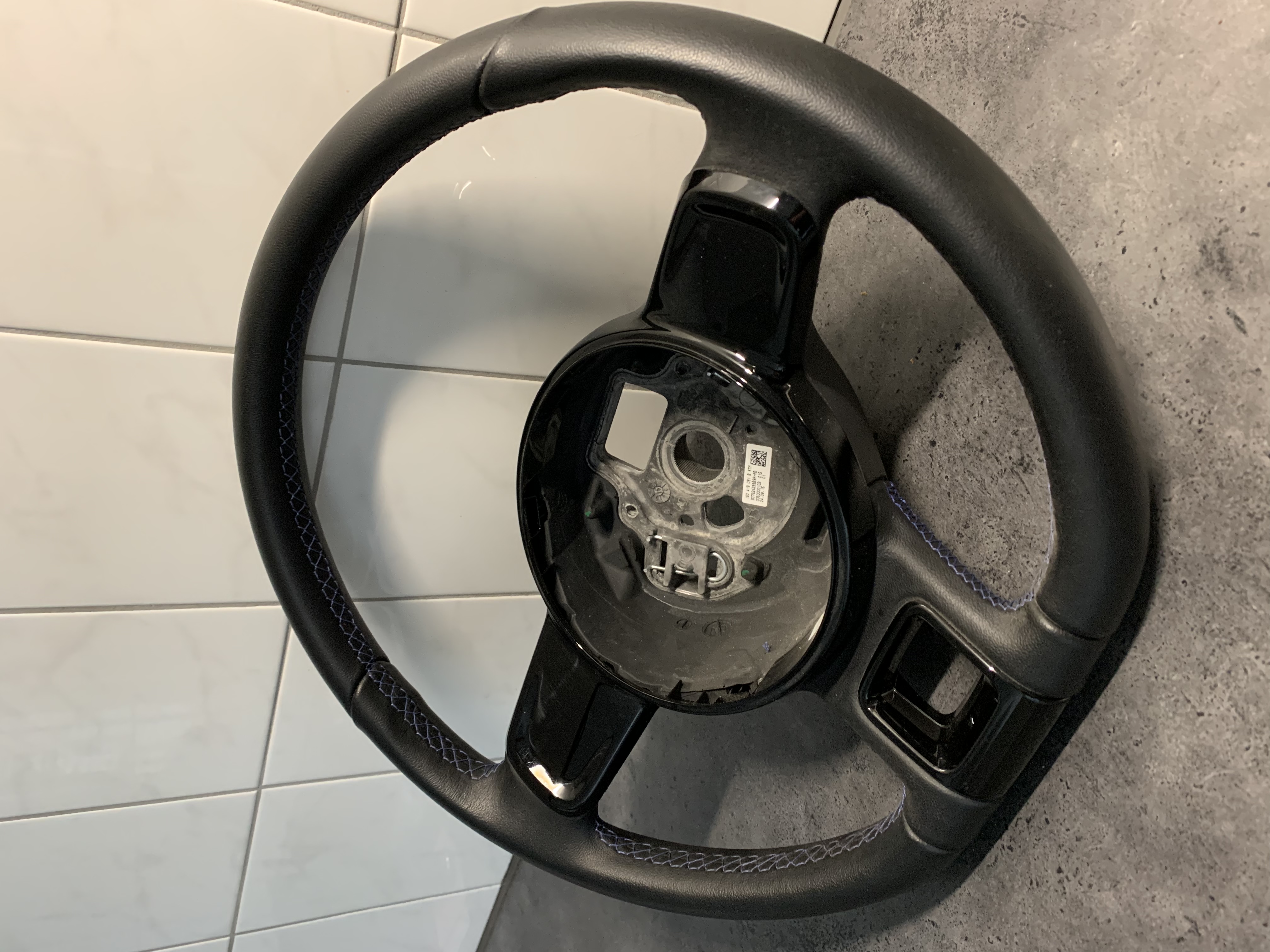 Vandaag gescoord, leren stuurwiel met blauwe stiksels
