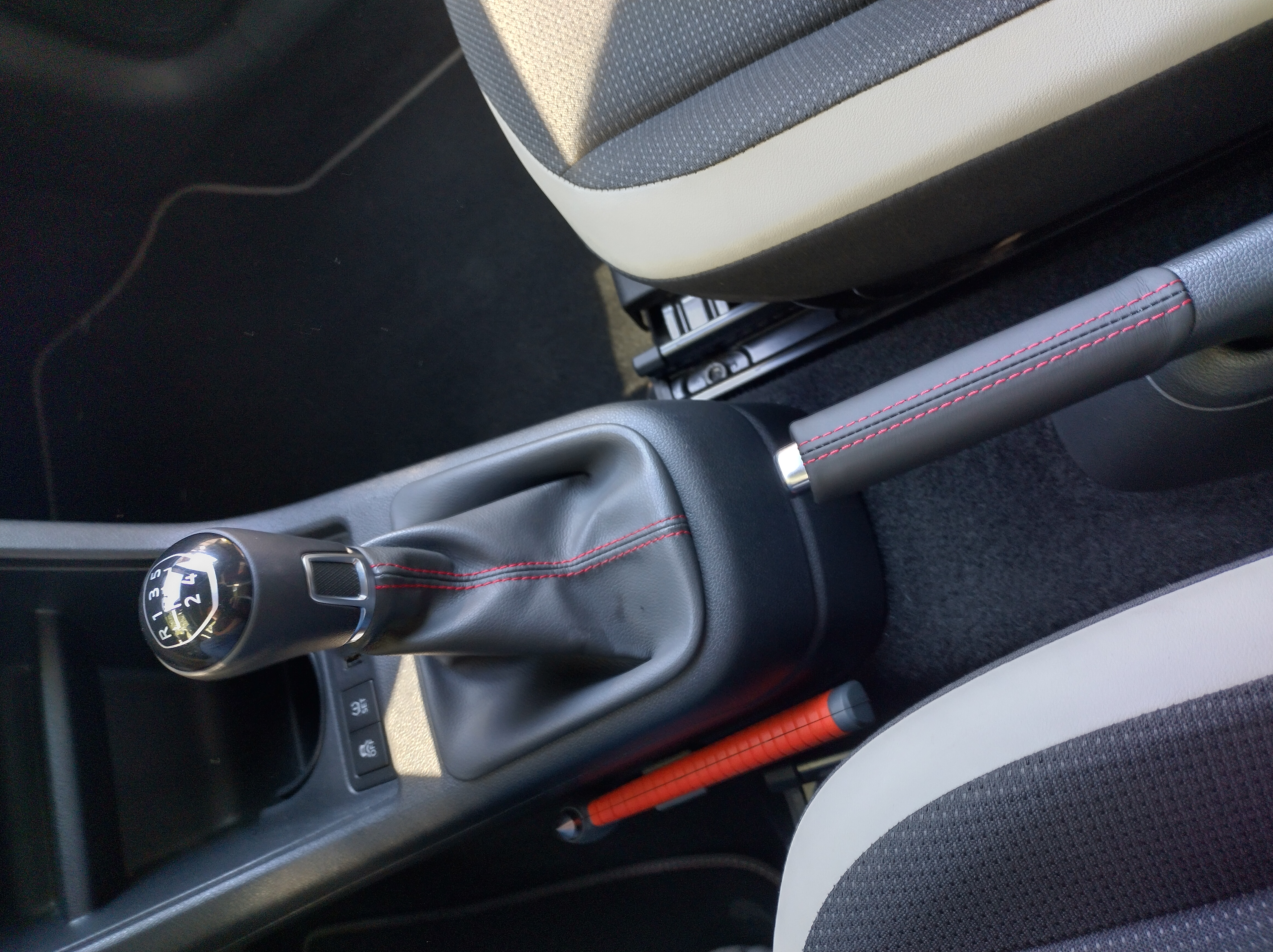 Inmiddels weer een paar kleine dingetjes veranderd. Zo heb ik de stiksels van de handrem en de pook veranderd naar rood