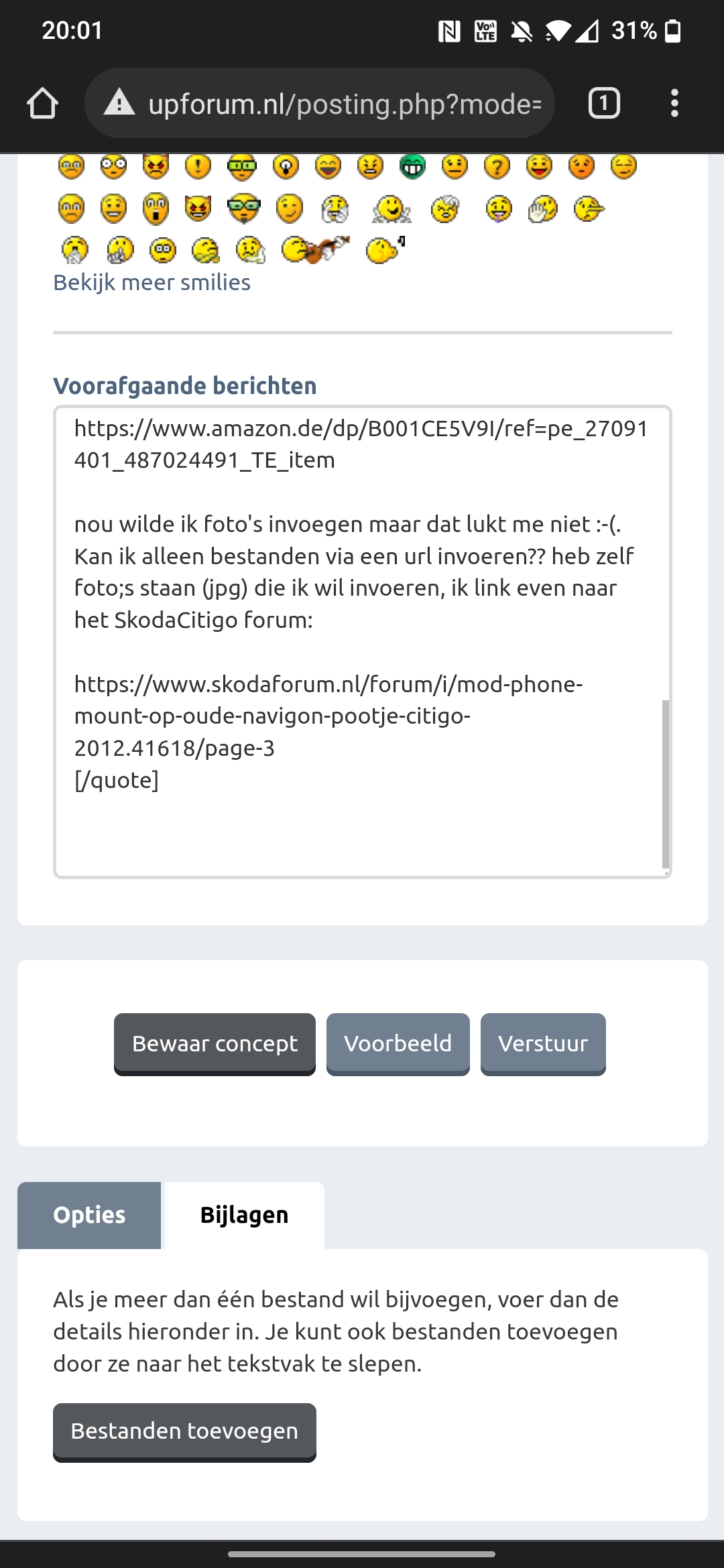 nou wilde ik foto's invoegen maar dat lukt me niet :-(. Kan ik alleen bestanden via een url invoeren?? heb zelf foto;s staan (jpg) die ik wil invoeren, ik link even naar het SkodaCitigo forum: